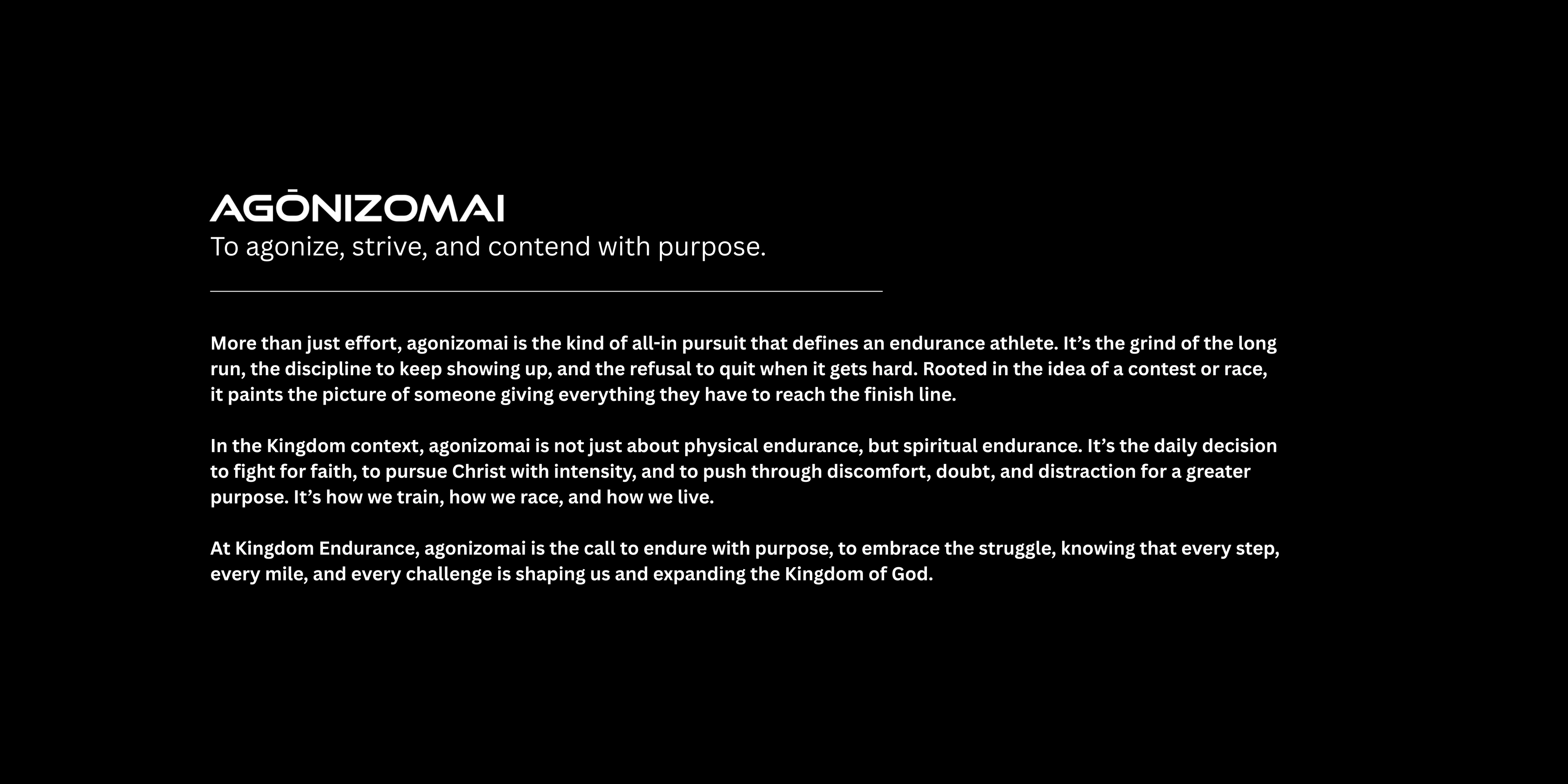 Our mission is to expand the Kingdom of God through endurance sports. We are a Christ-centered community of endurance athletes who train, race, and live with purpose. We exist to unite believers who love Jesus and love pushing their limits, creating a space to grow in faith, fitness, and fellowship. We contend together, conquer goals together, and glorify God in our training.